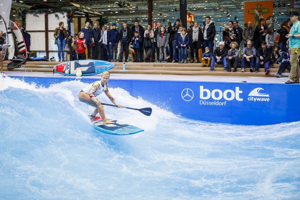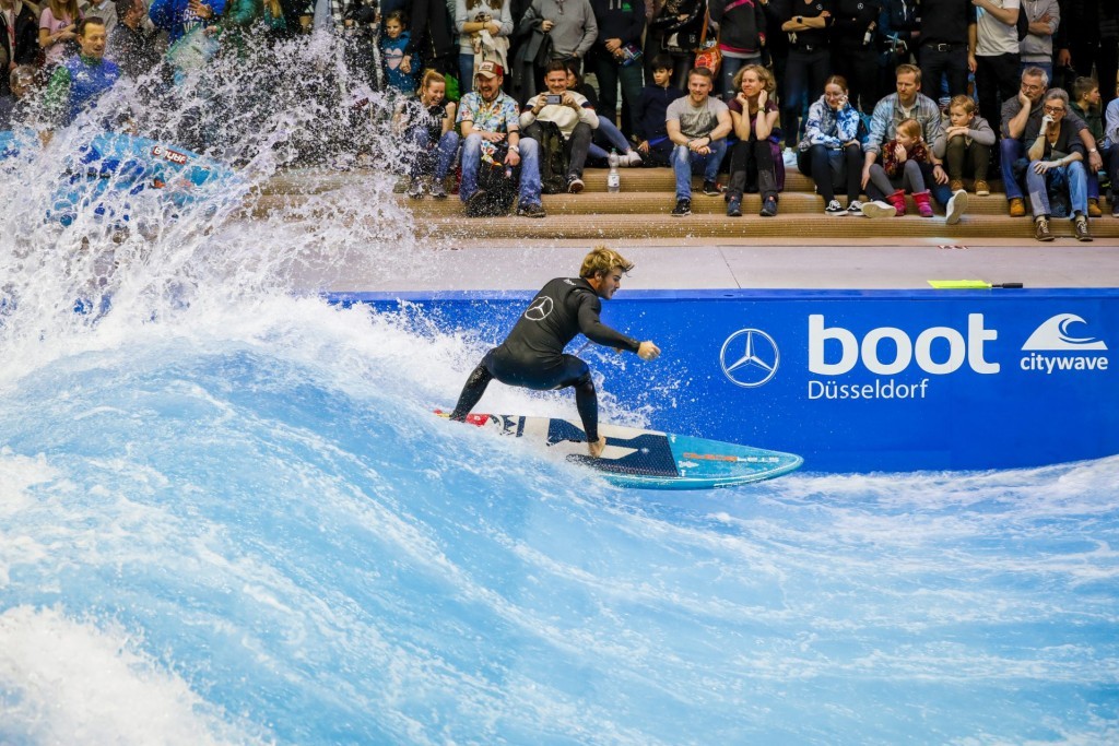 One of the highlights in the surfing paradise of boot Düsseldorf was the action on THE WAVE by citywave®, where 20,000 thundering litres of water per second created the highly popular standing wave and a motivating fun factor. Over nine days, fans were even able to experience for themselves what surfing feels like. Also, the wave stars among the surf and SUP riders showed what they are capable of.