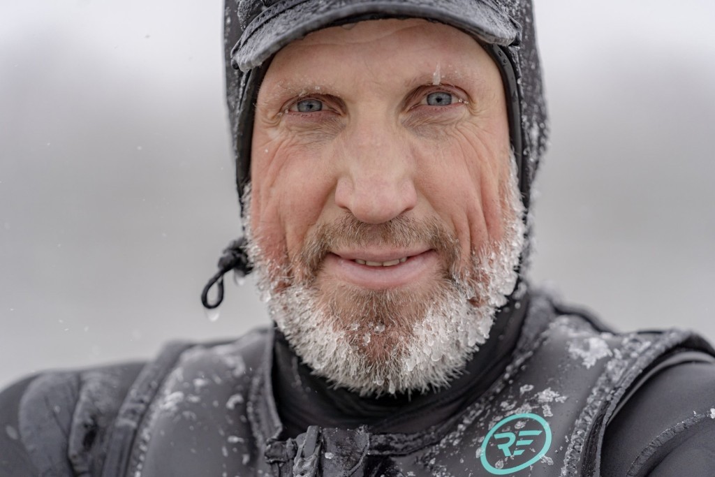 Divided into two groups – 3 kiters and 3 supporters – we walk from the car park to the place where the action will happen. Even the 1 km walk in neoprene shoes with thick snow cover is a challenge. King Winter reigns over the water, wrapping everything visible in his icy cloak. Snowflakes freeze in the icy wind to form tiny knives that cut painfully into the skin. Only ski goggles can protect the photographer’s eyes today.