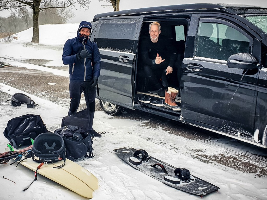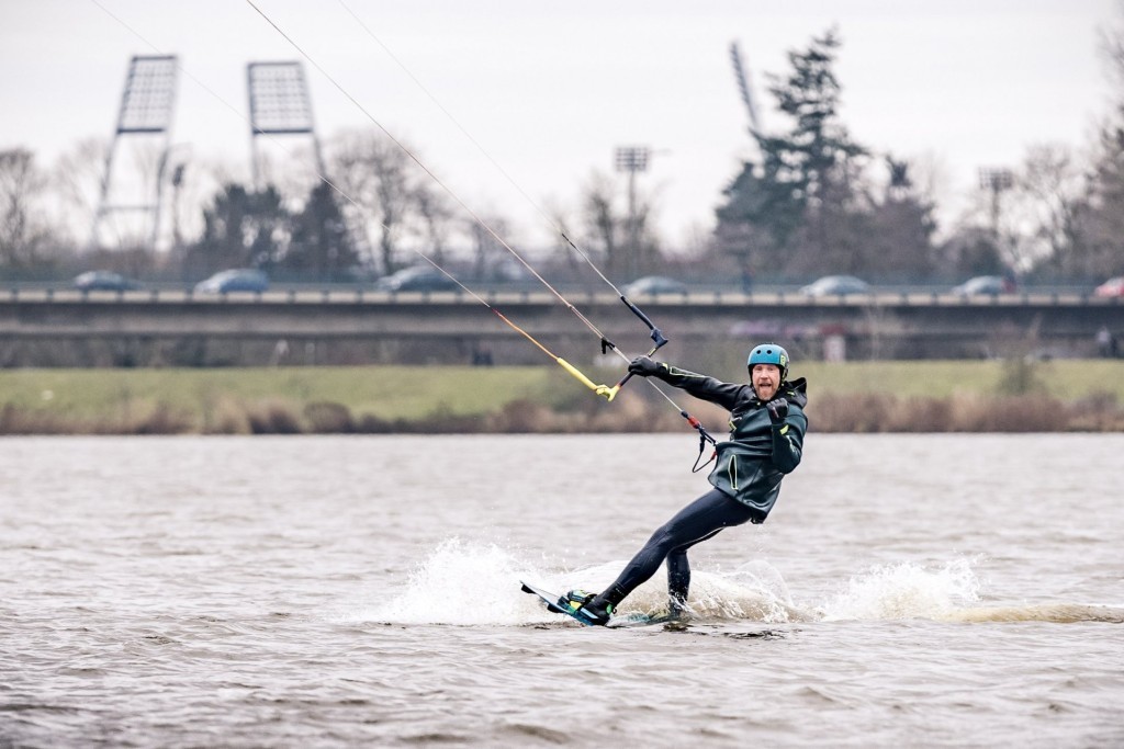 To find out, our local experienced kitesurfers Ihno and Denis go for a session to feel out the wind conditions and material limits on the Werdersee, practically in front of the Bundesliga stadium. Mission accomplished! Both are satisfied with the experimental city session and ready for the next challenge on the following “blizzard day”.