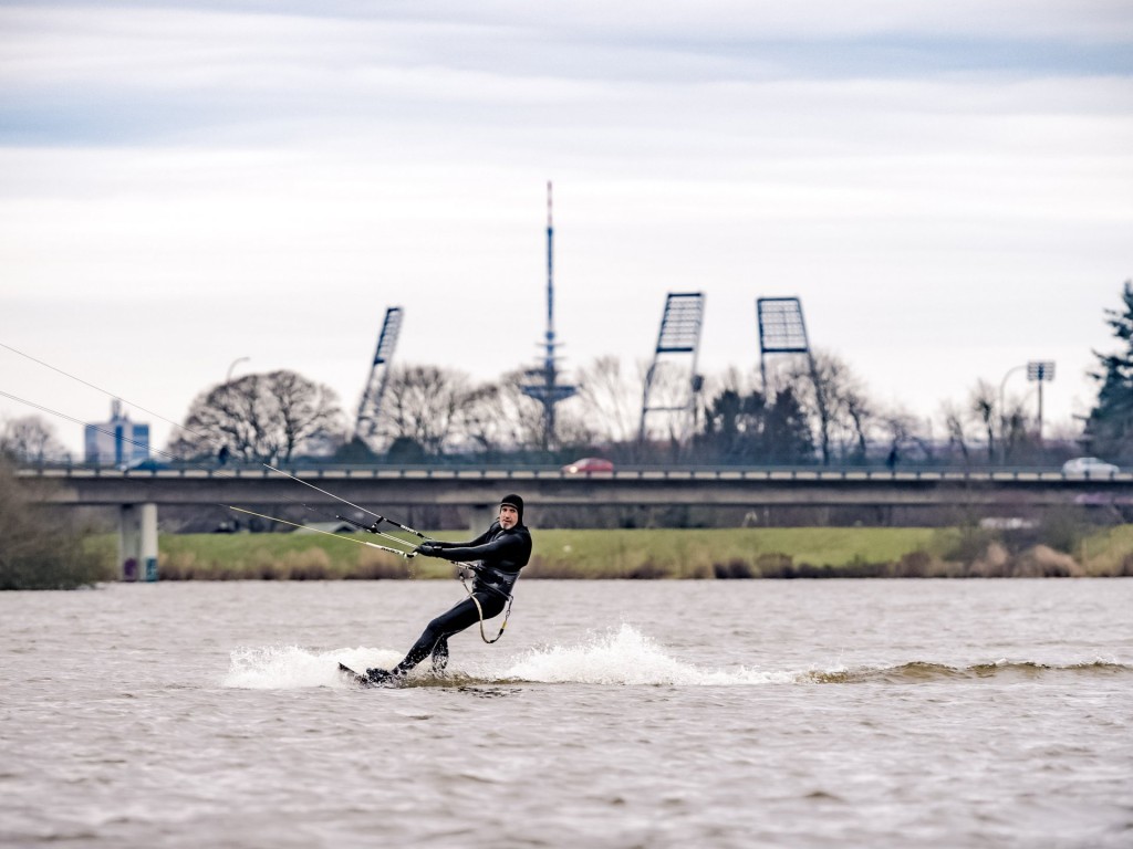 The North Sea beaches are off the map this weekend because of the snow-covered country roads and paralysed highways. Besides, the high tide neither coincides with the short winter daylight period nor the prevailing wind direction. So kitesurfing has to take place in Bremen’s city zone, but where and under what conditions would such a thing work?