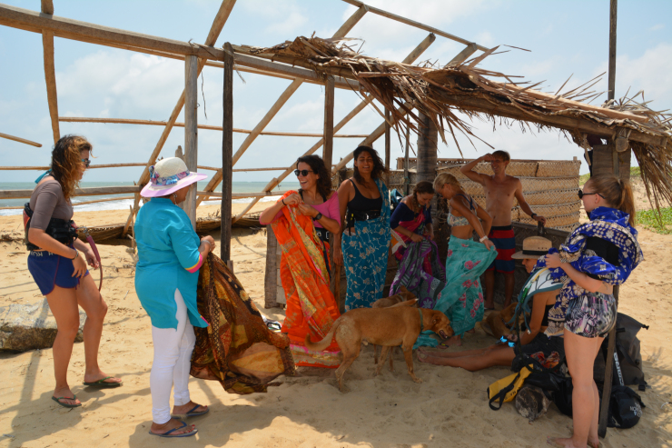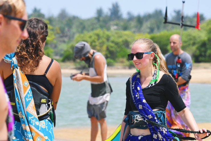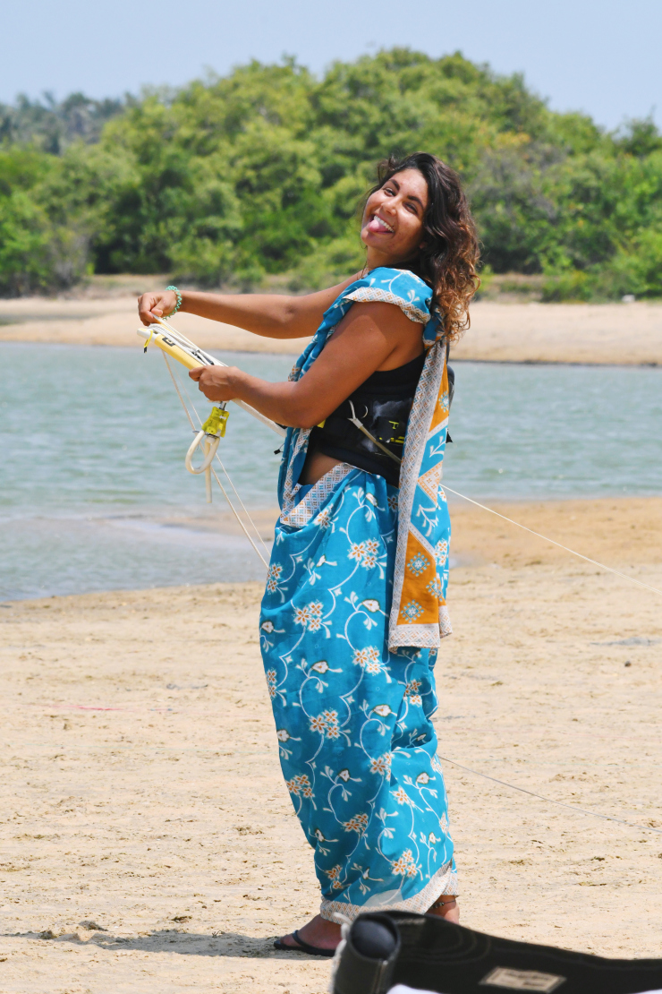 The dressing ceremony was serious stuff! Our favourite Kite House superstar Anais was in charge ensuring our sarees were tight enough to stay on, not so tight to be able to squat into that pesky board, had a harness sized gap and a safety leash clear of any obstacles. Once we were ready, the combination of colours from our electric kites and our shimmering Sri Lankan sarees, was dazzling, not to mention perfectly co-ordinated as shown by kite coach Fran.