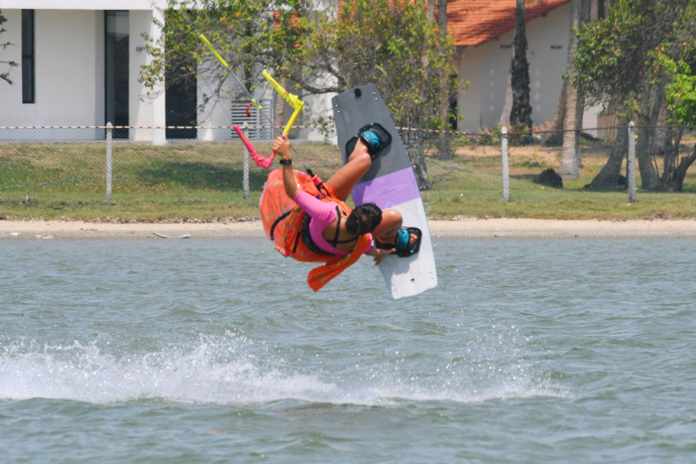 Off they went one by one with a buzz of excitement. It wasn’t long before the yells came from across the lagoon as our riders were feeling the incredible weight of a wet saree!! But send the kite a bit harder, and everyone started to get comfy; back rolls, front rolls, dark slides, all with a flow of colour trailing behind.