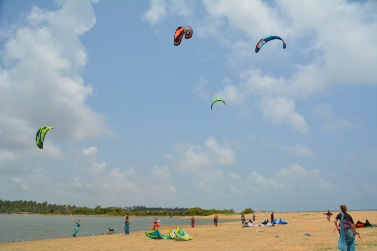 On Saturday, we invited She Flies girls (and guys) to the usually empty Kappalady lagoon with a bag full of Sri Lankan’s most beautiful Sarees. The sun was shining, the wind was on, and the atmosphere was electric as more and more were arriving with all of their toys and big smiles. Dil and his truckload of pals at Kitesurfing Lanka whizzed up the beach, Mawfeer and the gang at KiteKuda raced over the lagoon to join Marcel and us at Elements didn’t know what hit him when he just popped out for a quick wave ride upwind.