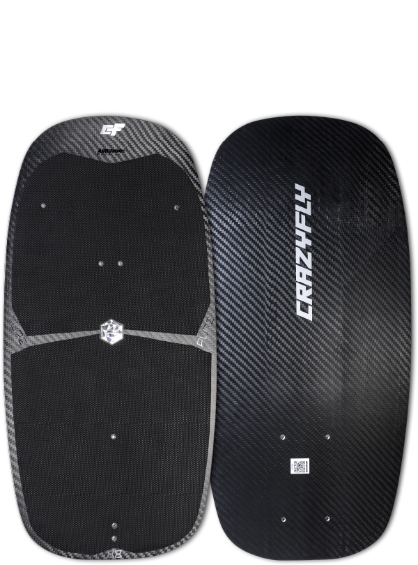Pure is a pocket foil board, unlike any other. Ultra-small with a simple minimalist design and extremely lightweight full carbon layup without any sacrifice to the performance. In its mid-size, 88 x 43 cm, the Pure board with full deck pad weighs an incredible 1,58 kg, making it the lightest foil board in the world. The Pure is a masterpiece of extreme lightweight engineering with air inside core technology and demonstrates outstanding expertise of CrazyFly in all areas of carbon fibre technology.