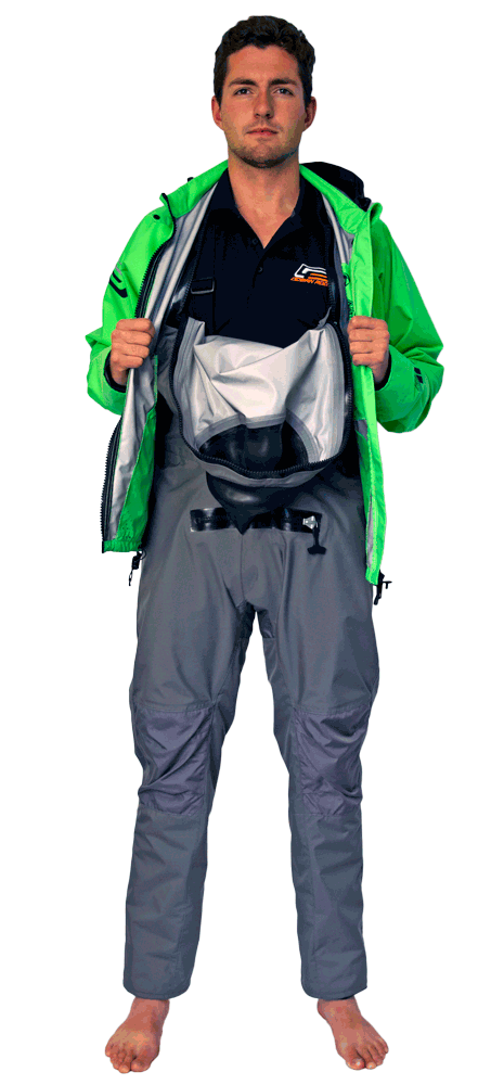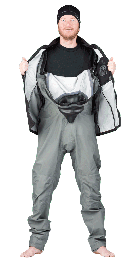 The suit that started it all, the Soul continues to be our best selling drysuit ever. In the Soul highly refined design meets technical performance. Built to offer you greater flexibility than any wetsuit and customizable levels of warmth the Soul features our revolutionary Captive Zip design, giving you the ability to choose fully “dry mode” or “standby mode”. When worn in dry mode the Soul is 100% dry and breathable. Between sessions, on your way to the beach or after your time on the water you can then open the dry zip and doff the neck seal. With the outer jacket then zipped up the Soul offers a well ventilated, hooded jacket and pants to protect you from the wind and rain. Converting from standby mode to full dry mode can be easily accomplished all while wearing your PFD.