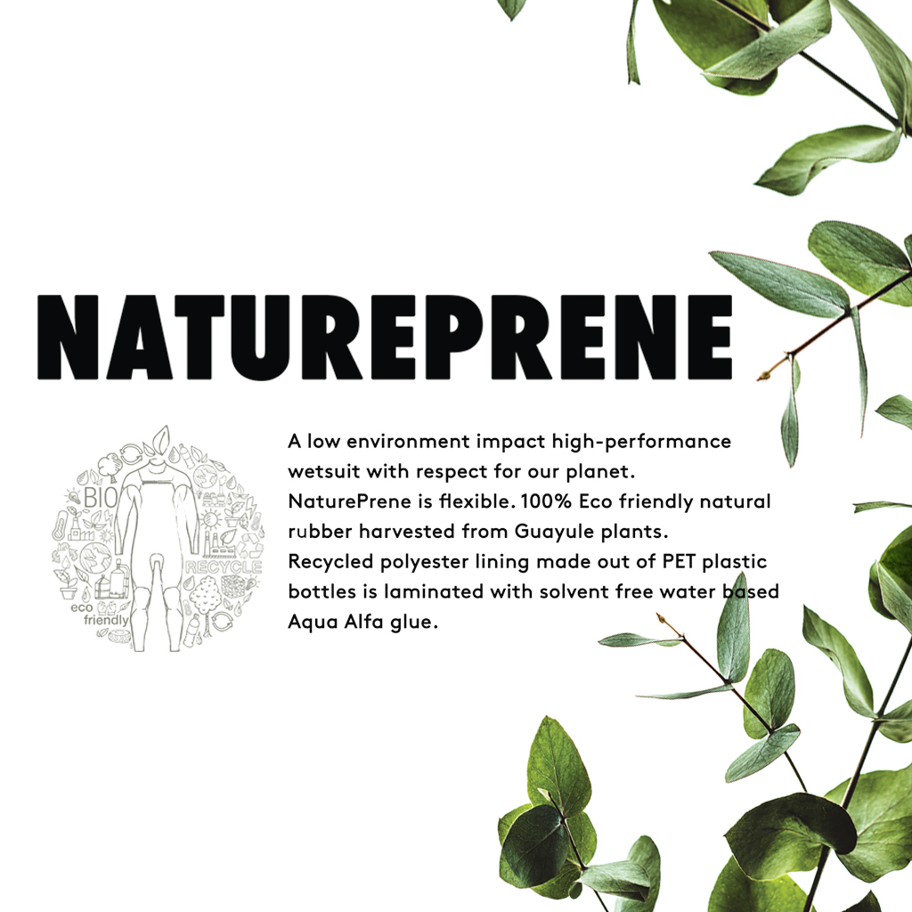 A low environment impact high-performance wetsuit with respect for our planet. Nature prene is flexible 100% eco friendly natural rubber harvested from rubber trees. Recycled polyester lining made out of PET plastic bottles is laminated with solvent free water based aqua alfa glue.