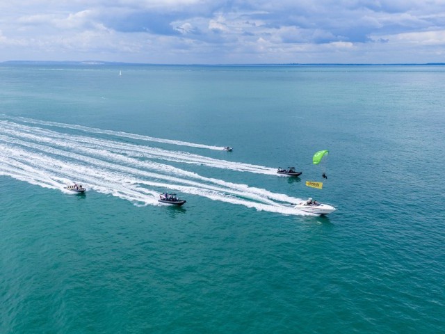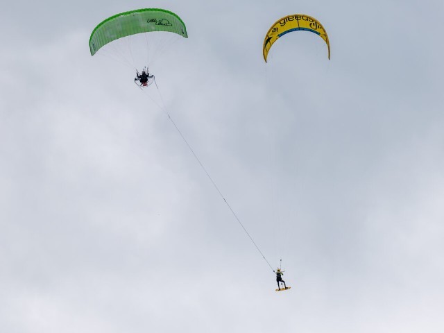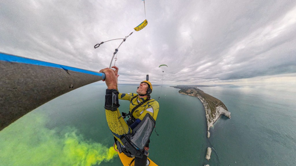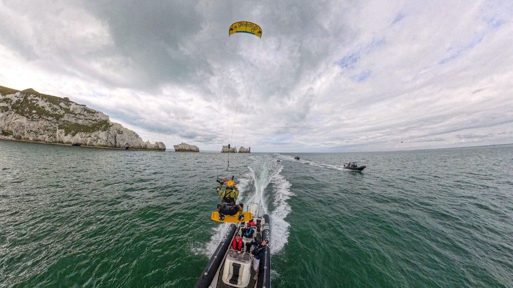 Likewise! The idea originated several years ago after I saw Chey Anich fly out to the Rampion wind farm, located off the coast of West Sussex. It’s more than 10 miles offshore, so we took the boats out as safety cover. It was my first look at paramotoring up close, and his skills really impressed me. It was mental. Building on this, we began experimenting with attaching a wakeboard tow line and handle to the paramotor to see if Chey could retrieve us from the water. We discovered he could easily take our weight, even picking us up from the boat and transferring us to another, like something out of Mission Impossible. I then had a lightbulb moment that this concept could be adapted to work with a kite, too – and here we are.