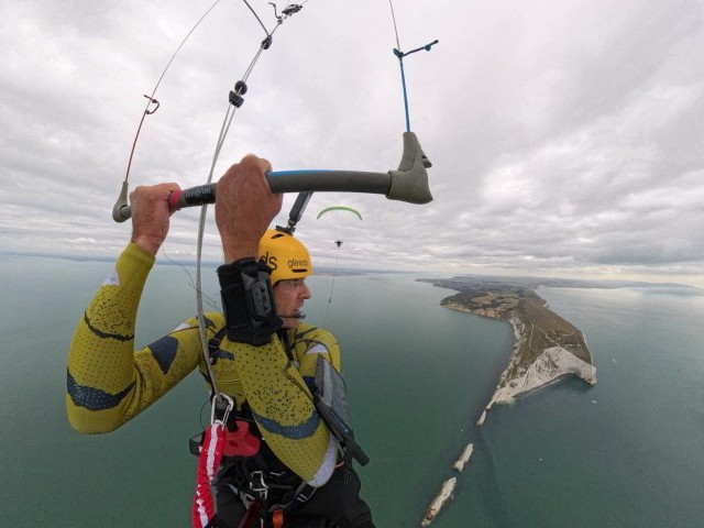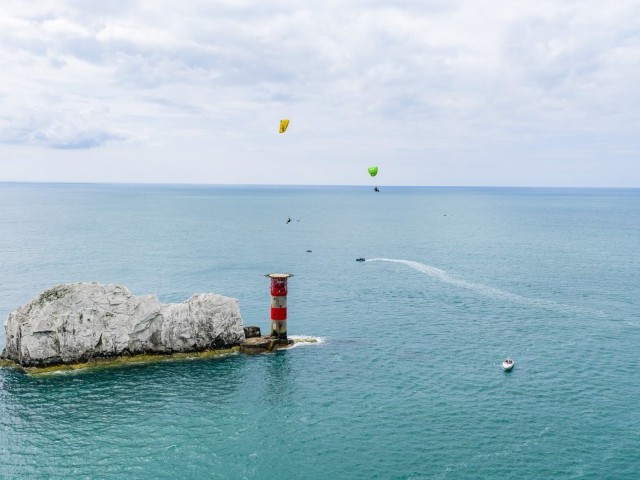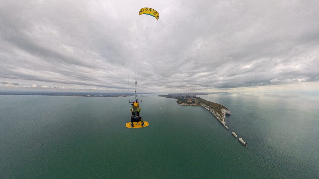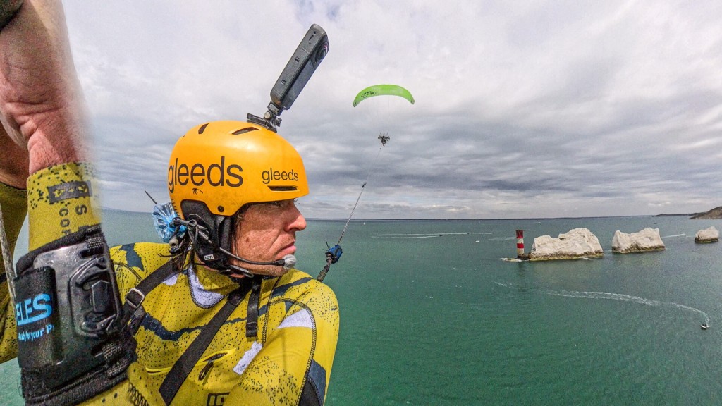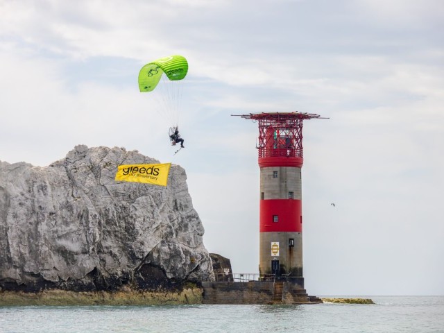 One of the biggest challenges was building a tow system that was both safe to use with a paramotor and also worked as a gimbal, allowing multiple directions of pull under tow, so Chey didn’t get pulled off course. We also had to design the tow system to have a release mechanism at either end so we could both detach in an emergency. We practised a lot in a range of conditions and found we had an upper limit of around 20mph – any more than this and it became quite dangerous for the paramotor as he had no forward penetration against the wind. We had a set window in the diary for the stunt, so we needed to be able to perform in a range of conditions. The weather was definitely a big concern; any rain would have stopped us in our tracks. Conditions can get quite rough at The Needles, too, so we were keeping our fingers crossed for a calm, dry day, and luckily the wind gods were kind to us and we were able to pull it off on the first attempt.