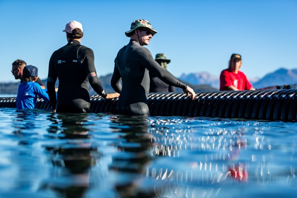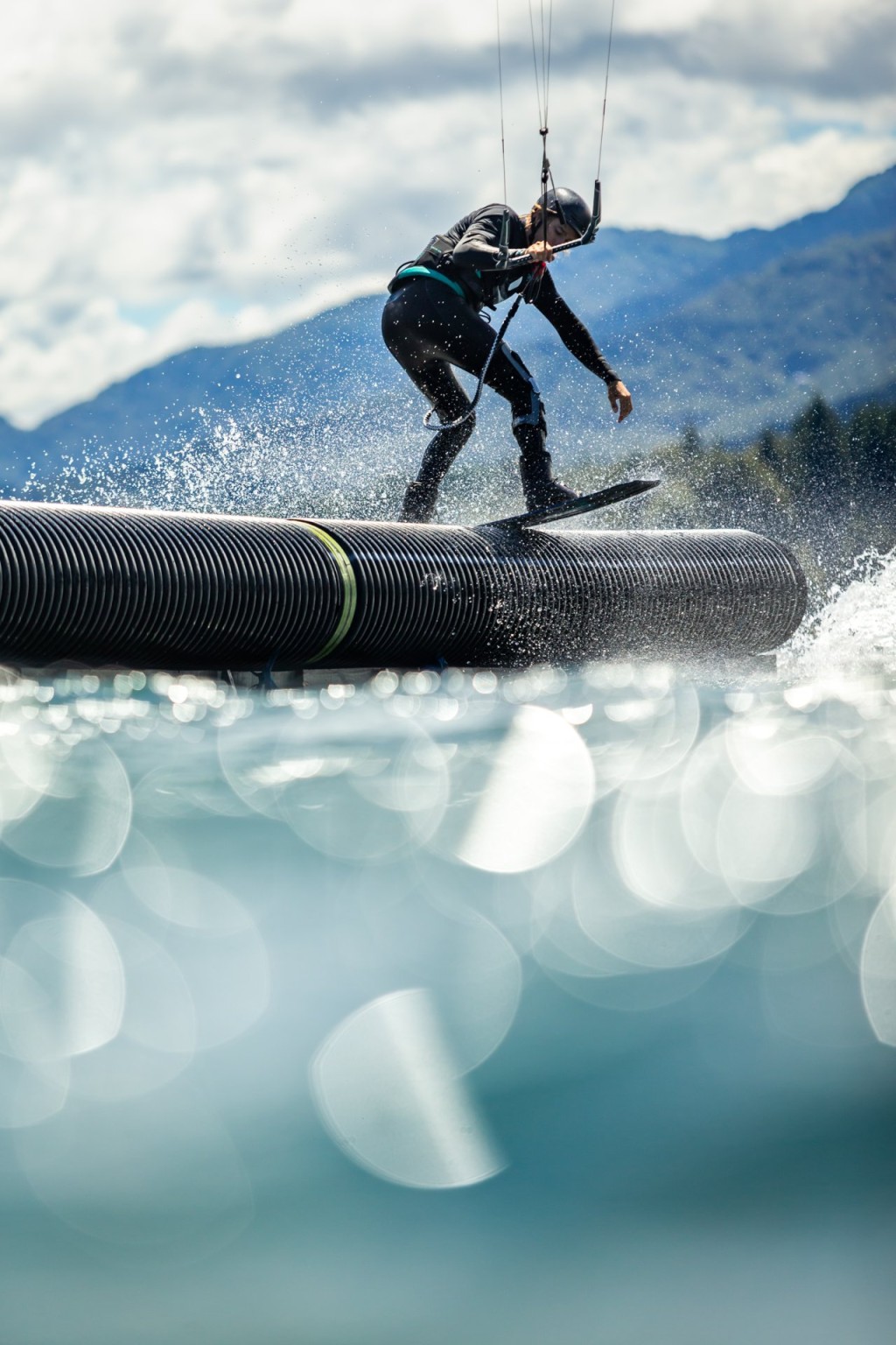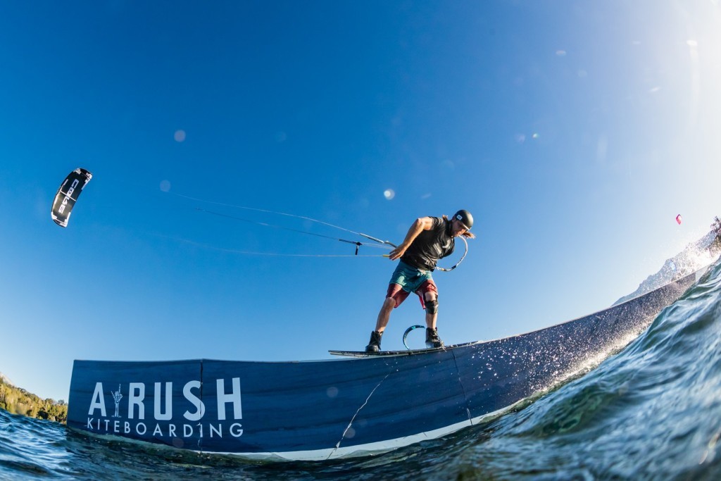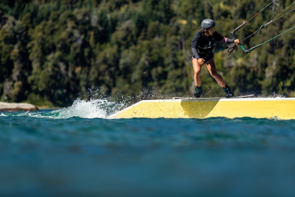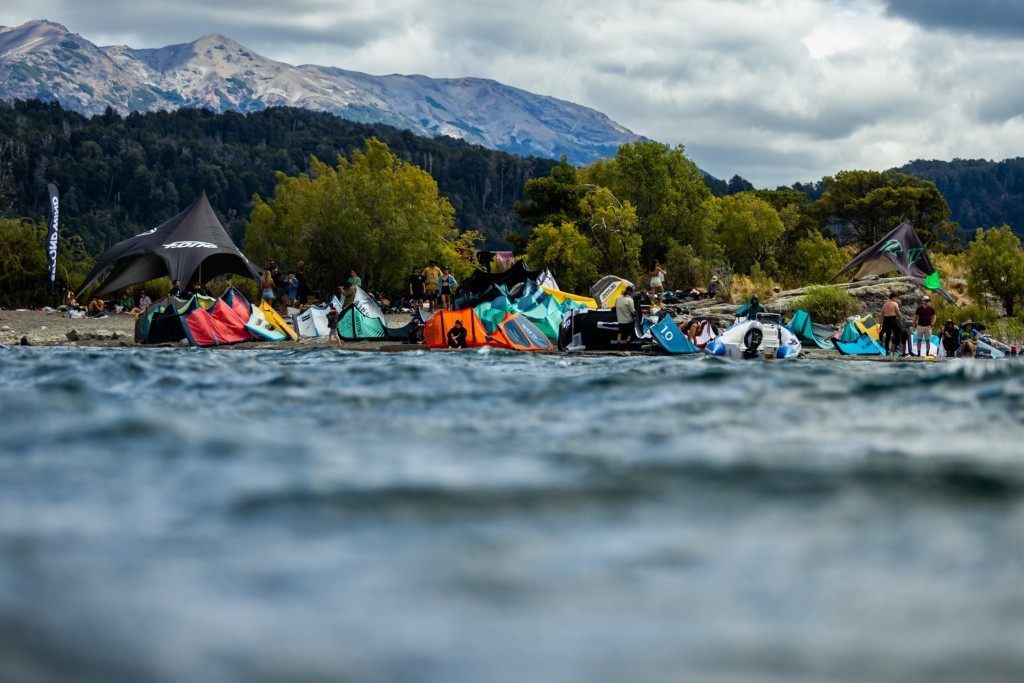 Back to the event! The spot is on an island in the Bahia Manzano area; it’s quite a unique spot as it’s rare to find flat water that is relatively shallow in these outstanding and untouched lakes. Thanks to its location, the wind gets smooth because it’s in the middle of the lake, as far as it can be from the mountain line, leaving the mountains just as a backdrop, which feature in a lot of the stunning shots Andre Magarao took during the event.