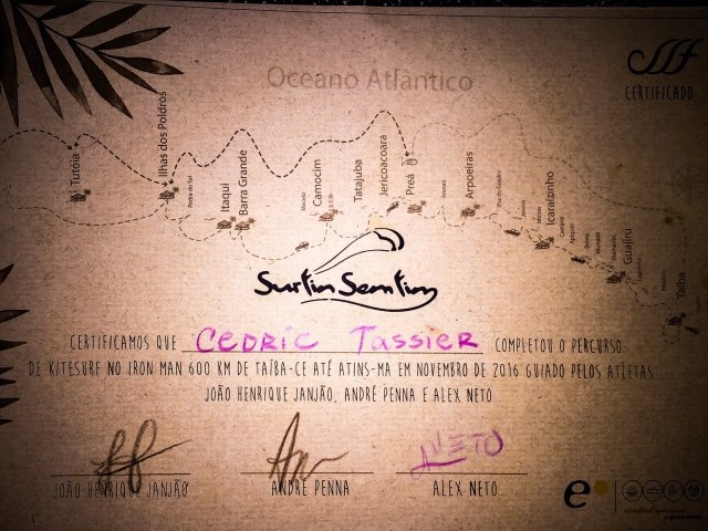 The 6th and final day of the kitesurfing Ironman challenge! Despite some pain, the team felt ready to finish this challenging adventure of 600 km of kitesurfing. It was a very technical day of 130 km and more than 7 hrs on the water. We had to pass some huge river mouths with strong currents and unexpected waves. Even if the whole team was tired, we were impressed by the unreal, wild landscape of the Parnaiba Delta (one of the biggest in the world) that we had to cross. For the last part, we had to cross a scary beach where the waves crashed in the middle of thousands of sticks, that looked like swords. This beach was the destination. Once again, we arrived just before the end of the day at Atins, an untouched fishing village in the middle of nowhere. It’s with a lot of emotion that the team felt the “mission accomplished” and we enjoyed a nice welcome drink on the beach while watching the sunset. Later, we had a lovely diploma ceremony organized by Surfin Sem Fim. During our last dinner, we all agreed that this was a once in a lifetime experience that would never be possible without the drivers, Andre, Janjão, Alex and Jalila.
