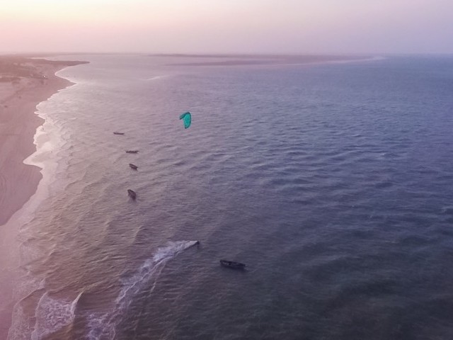 the day before. The whole team felt that the real challenge had started. We did the first part easily and reached Ilha do Gajiru. After a lunch break on the beach, we left Ilha do Gajiru, where two routes were possible. The safest one is far away from the beach and far from the dangerous fish trap,s but with choppy water. It was where the whole group decided to go. The other route was riskier, in the middle of the nets, but the temptation of full speed and mega loops in ultra-flat and very shallow water was too much for Alex, JanJao and I. With the knowledge of our friendly guide JanJao, who owns a posada not too far from where we were in Icaraizinho, we managed safely. At the end of the day, we raced to reach Préa before the sunset! The team achieved their goal, but not without some effort.