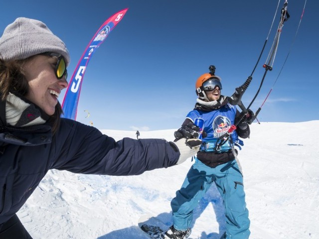 The race briefing on Friday morning was filled with both excitement and nerves. The route was set: 100km around a 5 lap course with a time limit of 5 hours. With the wind forecast to drop steadily throughout the day the competitors were keen to get going. Lorries and coaches were loaded up with kites, snow gear and people and off we went!  We arrived at the plateau to find absolutely zero wind: it was going to be a challenging day. Nevertheless, we grab our gear and start hauling it to the launch area.  This would be the first major challenge of the event, dragging four kites, several bar & lines and a pair of skis in knee deep snow was exhausting. At that moment I would have paid good money for a lift on a skidoo!