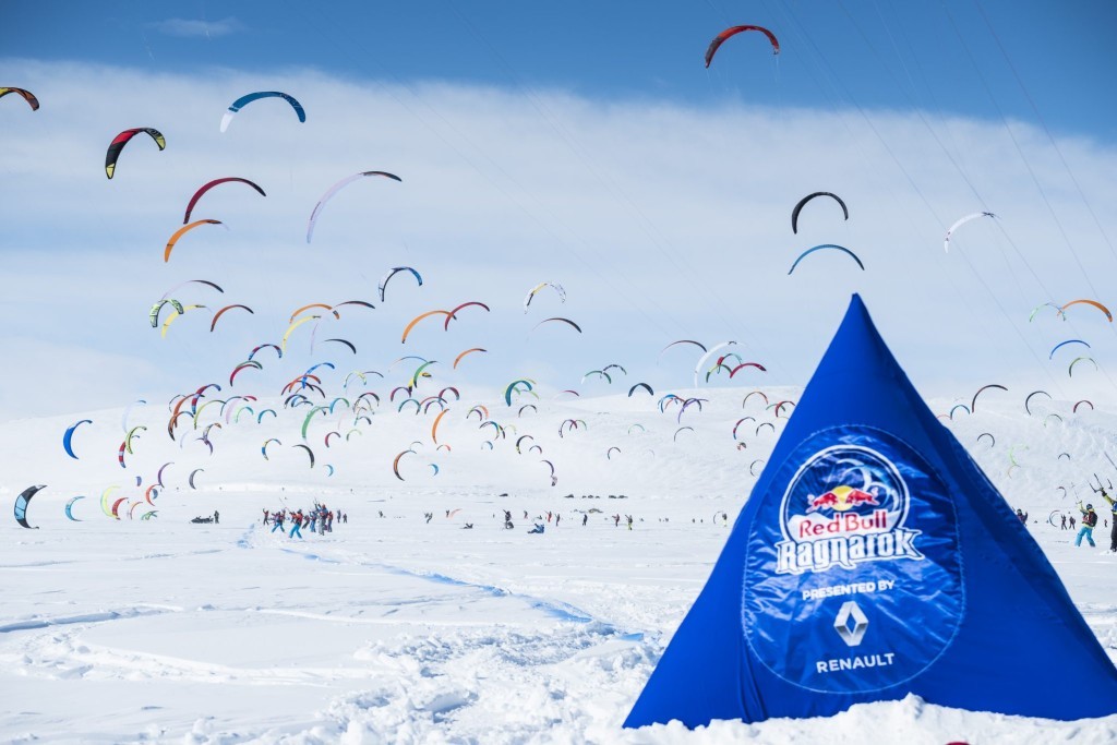 Adrenaline was high as we raced to gate 1, the feeling of this race is indescribable. Passing through gate 1 in around 15th place I down-looped my kite and nearly wiped out – clearlystill getting used to those mega skis! Through gate 2 and we were quickly heading towards a cliff, as I ski down it I looked to my left to see a snowboarder had boosted off it and was flying through the air 30 foot up (see this POV edit from that jump: https://www.iksurfmag.com/kitesurfing-news/2018/04/red-bull-ragnarok-2018-in-2-words/ ).