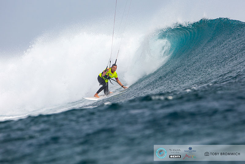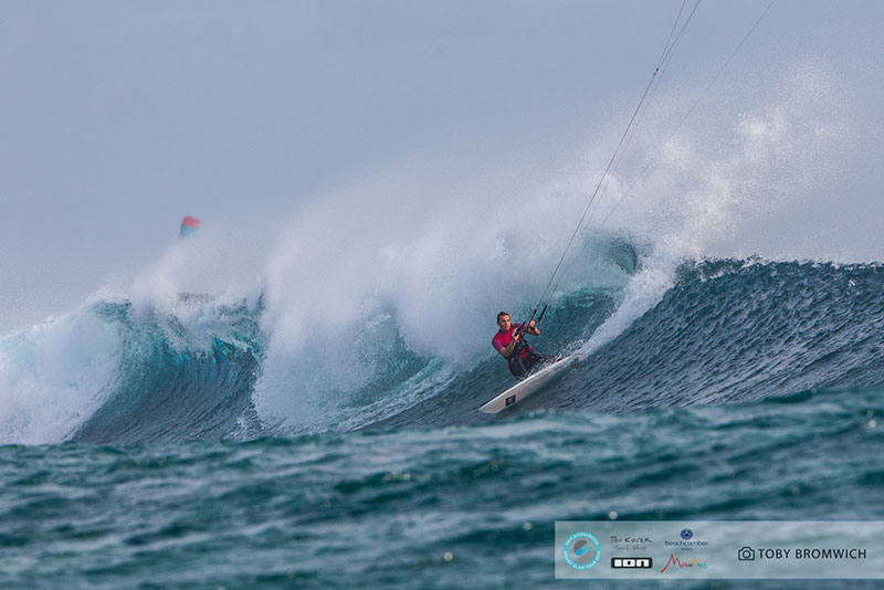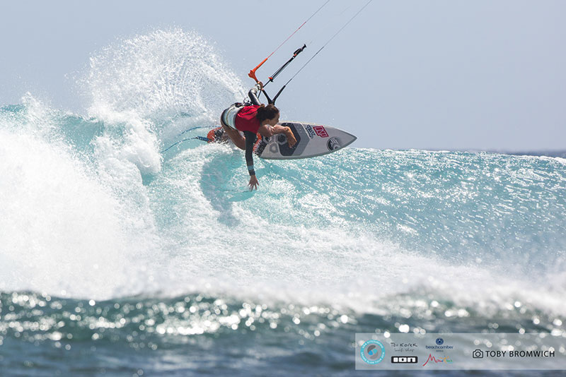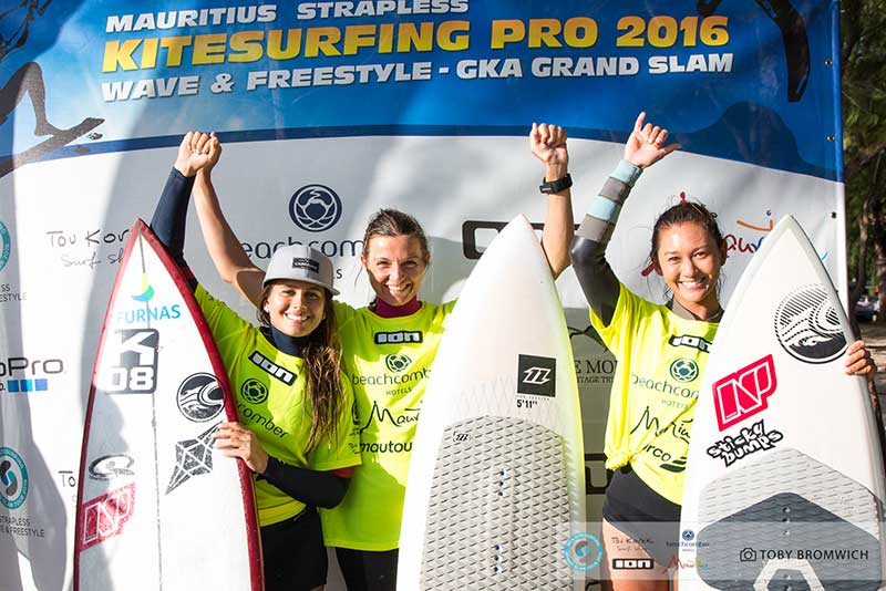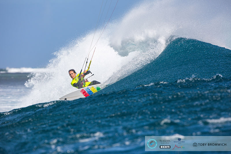 The girls had to wait until the conclusion of the guy’s contests yesterday here in Le Morne to get their first taste of competition at One Eye. Three days spent training upwind at Chameaux paid off as we were treated to a show of measured power and finesse in the surf.