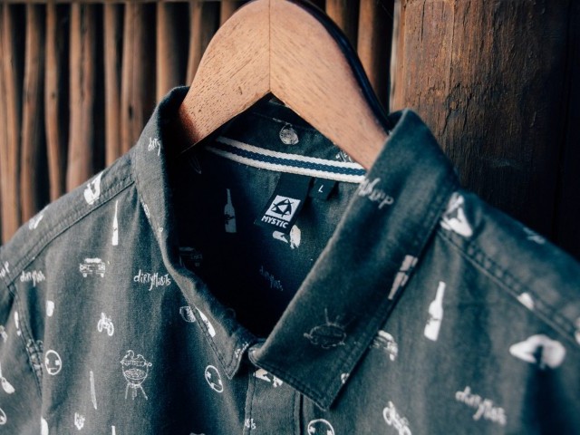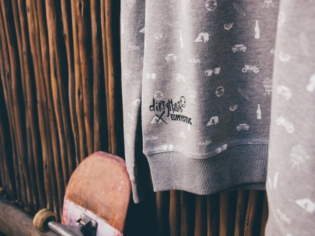 Designed by the Graham Howes in his home town Cape Town and the MYSTIC creative teams, the line consists of 5 apparel pieces; Boardshorts, tank top, tee, party shirt, and a sweater all which feature the Dirty Habits X MYSTIC branding.