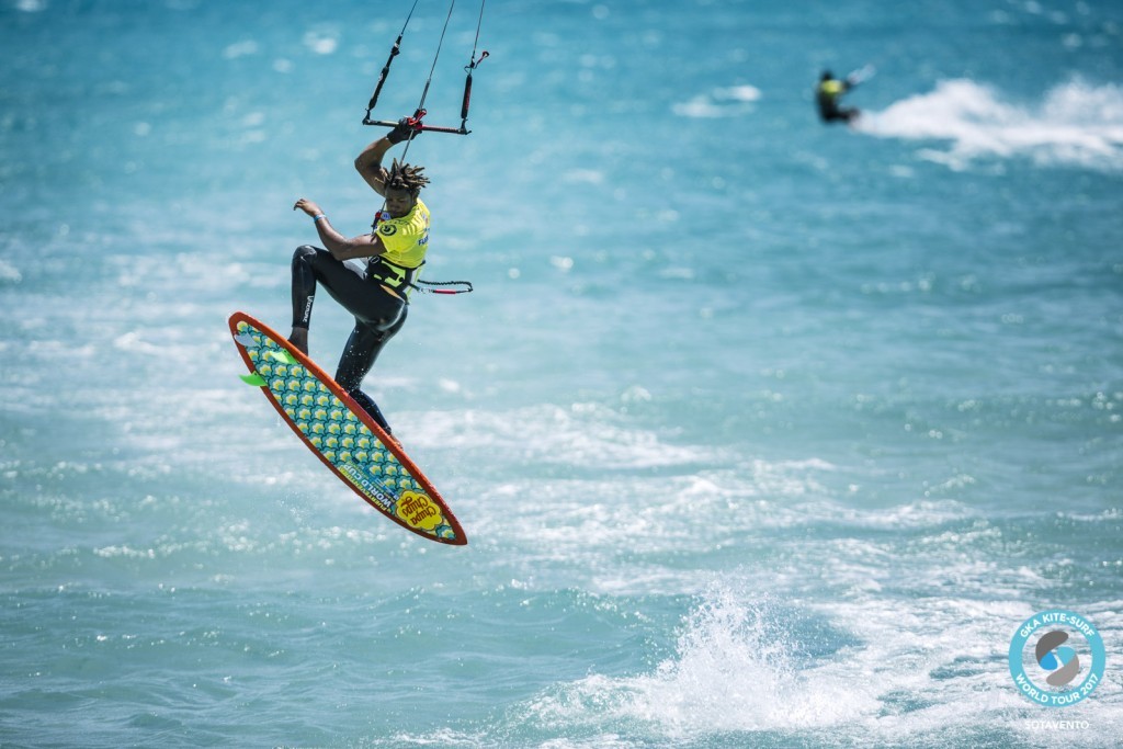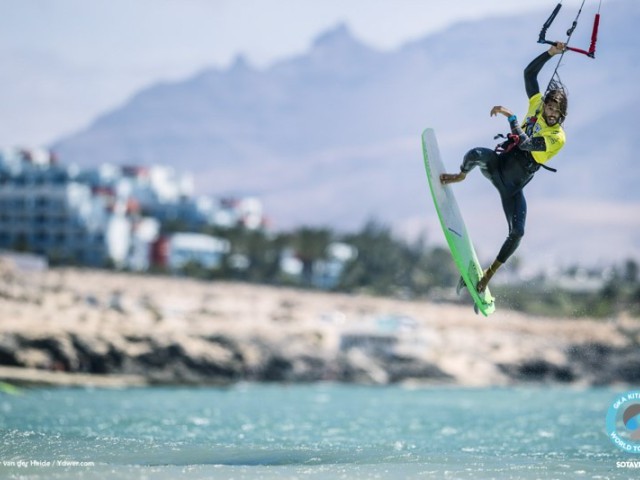 A steadily building wind greeted the riders today as they prepared to pitch into the main event. Before round one kicked off, a handful of riders competed in three heats to gain their seedings and local riders Kuba Juras (originally from Poland) and German transplant Thorben Jasper looked perfectly at home in the Sotavento conditions while crowd pleaser Luis Brito clearly relished being back in Sotavento, nailing a variety of flamboyant tricks from the off.