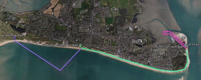 2. The course. We are trying to give ourselves the best possible chance of running all three legs, Kite SUP and Run…so we need a bit of wind, and we need a flatter more protected area of water for SUPing in case it gets really windy. Please see the course we are currently planning below. It does mean we have a slightly longer run at around 2 miles rather than 1 – but this means we can get round to the protected waters behind the RNLI station for the SUP. It’s a lovely run along the beach – and you can take it easy and walk bits if you need to so don’t worry!
