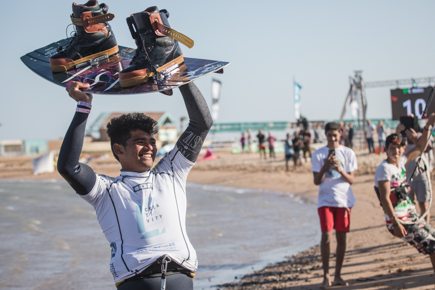 Carlos Mario made history during the Men’s final, with the most outstanding heat ever seen in WKL history. The Brazilian current World Champion landed 5 tricks scoring above 9, and two perfect 10’s. The spectators, fans and fellow athletes could only watch on in astonishment. His performance has catapulted competitive kiteboarding into a whole new level, and his fellow competitors face a stern challenge to try and keep up with him. Luis Alberto Cruz rode phenomenally well, and was sitting in 2nd place, when he had an unfortunate crash on his 5th trick attempt. He had to withdraw from the heat, and was taken to hospital to be treated for a suspected broken rib. He is now recovering well. Despite not being present for the remainder of the heat, his solid scores meant that he still managed to finish with a 3rd place podium finish, a bit of compensation for having giving it his all and having to suffer the painful consequences. Adeuri Corniel from the Dominican Republic crashed his first trick attempt, but then gained his momentum and consistently landed every other trick attempt with favourable scores, and was rewarded with 2nd place, the best result yet for this young and talented athlete. Liam Whaley entered this final with the focus on winning the event, as he had done previously in Leucate. He knew that it was all or nothing, he had to go big and take some risks in order to stand a chance at winning the heat, but unfortunately, 4 crashes cost him dearly, and he was unable to climb his way back up. He finishes the event in 4th position. Carlos Mario wins the Elite League event here in El Gouna!