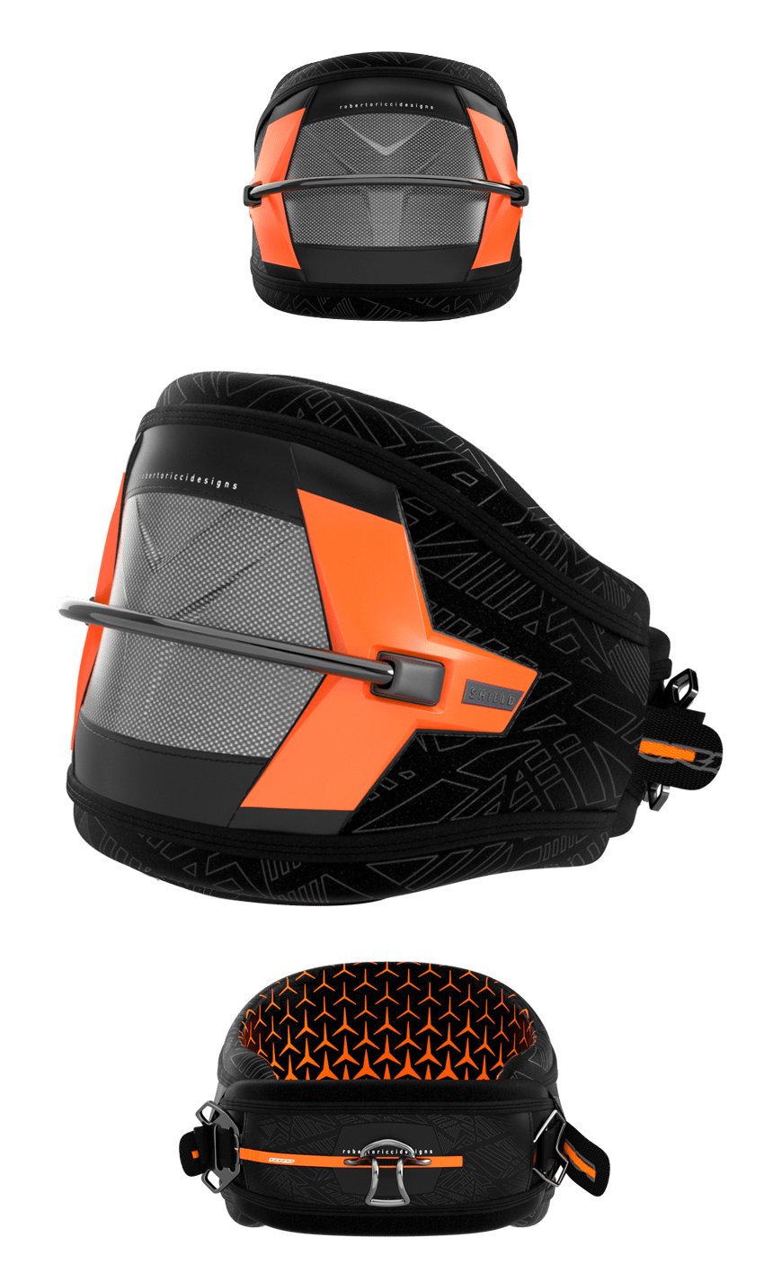The Thrive harness has a more vertically curved shape. This makes it the choice for users with a more curved lower back or riders that prefer a more upright riding position, like free-riding and down the line wave riding. The new padded spreaderbar with stabilizer wings locks the bar in place and eliminates the hook riding up and protects your ribs.