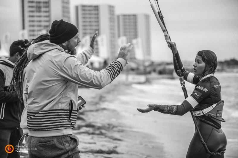 Pauline and Mika are two of the slightest athletes on tour and French rider Pauline took the longest to adjust to the strong 28 – 32 knot conditions, having the bar ripped roughly out of her hands early on while trying to build handle-pass scores. Mika meanwhile landed a slim 5 before safely compiling a couple of solid kite loop scores. On Fabio’s signal, Mika was in for a slick pit-stop, upping her kite size to a nine-meter and grabbing her foot-strapped board. Nailing the double front board-off on her first attempt she was safely ahead with five good tricks to two.