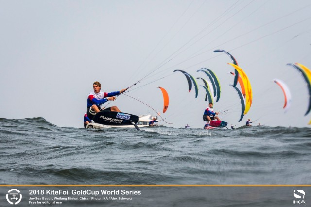 British athlete, Guy Bridge charged up the leaderboard on the third day of the KiteFoil World Series at Weifang Binhai, in eastern China, with scintillatingly-quick and accomplished racing that earned him a hat-trick wins. The wins catapulted Bridge, the younger sibling of Olly Bridge, up the rankings to third spot overall on a day of confusingly-mixed conditions that finally came good late in the afternoon, enabling the race director to squeeze in four races.