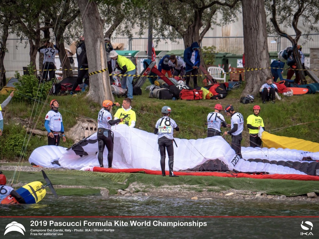 But on day three of the world championships off Campione del Garda—supported by Regione Lombardia—rain and thundershowers stopped the reliable Ora thermal winds from building and prevented any racing.