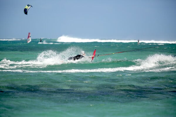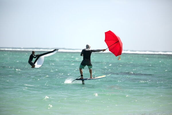 Lately, we’ve seen numerous leading manufacturers testing handheld wings, and we’ll be seeing these wings appear in their 2020 collections. One of the prototypes has recently appeared for testing on our local beach in Le Morne. I spotted a rider on a foilboard holding an inflatable wing, and my first thought was, I wonder if an ordinary umbrella would work?!