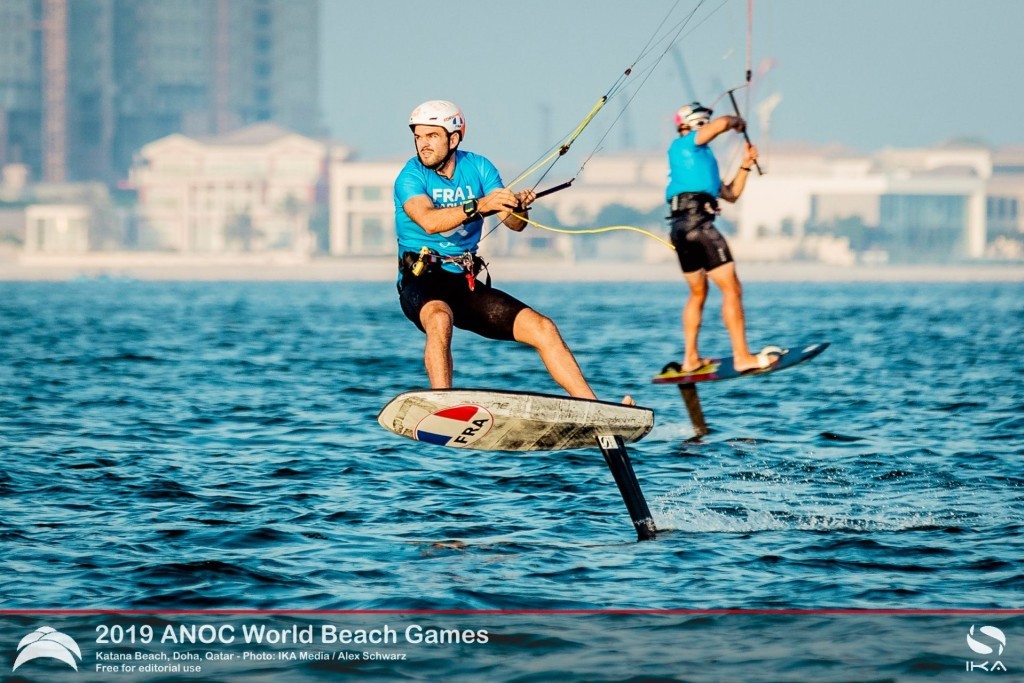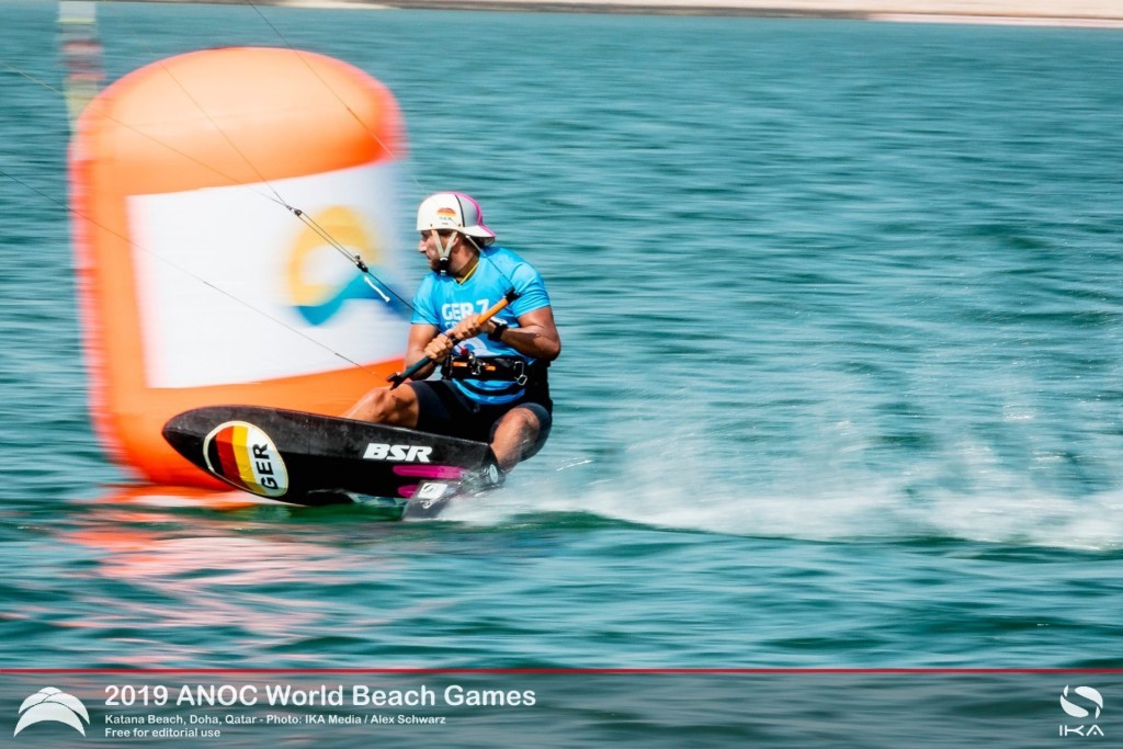 Golden Gruber grabs victory in kitefoiling nailbiter! Former world and European champion Florian Gruber (GER) won two consecutive races in the final to become the first men’s Kitefoil Racing ANOC World Beach Games champion.