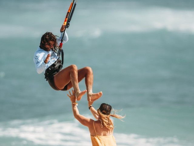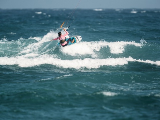 The second day of the GKA Kite-Surf World Tour got off to a smooth start this morning at Kite Beach. The wind was (slightly) more favourable than yesterday, with around 25 knots blowing cross onshore, the swell was coming in a little bigger too.