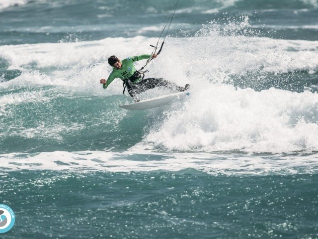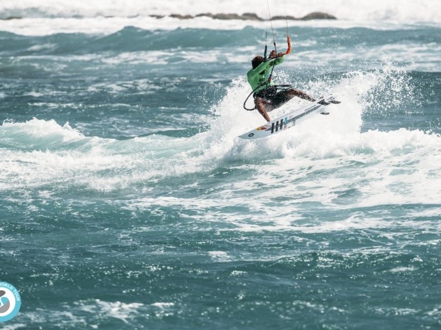 In the third heat of the day, Charly Martin RE, the youngest athlete competing, faced one of the top seeds, Matchu Lopes SP. Charly kited extremely well, matching Matchu’s 360 within seconds, and landed a smooth air 180 on the nose of his board. But experience and solid bottom turn in the pocket got Matchu an 8.43 wave of the day; this is also the highest-scoring wave in the competition so far. With a complete score of 15.33 Matchu goes through to face fellow Cape Verdean, lifelong friend, and Duotone teammate Airton Cozzolino CV in the next round.