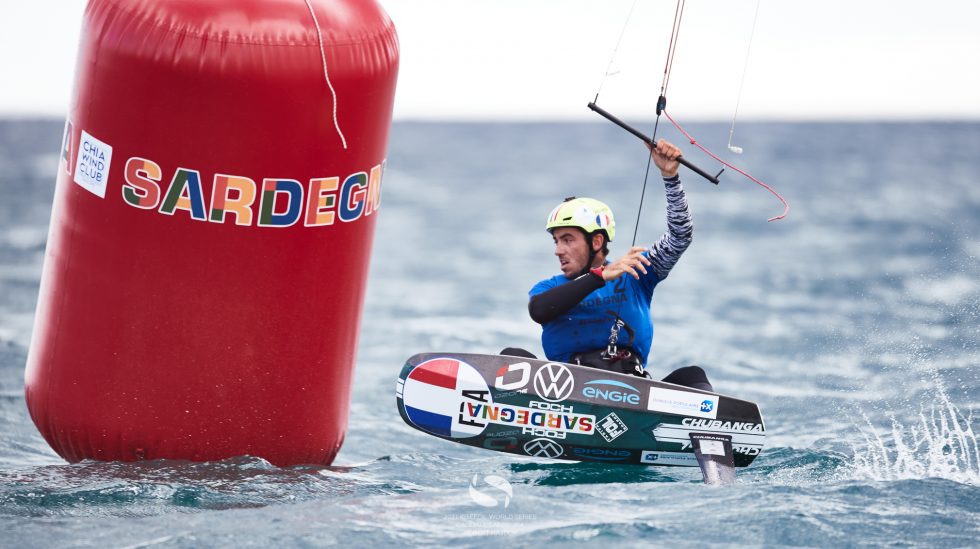 After “warming-up” on the opening day, Axel Mazella showed all his pure talent in Golfo degli Angeli‘s waters on Friday, October 8th. The Frenchman dominated the second racing day, going up to take the overall lead at Sardinia Grand Slam, IKA KiteFoil World Series‘ round 3, taking place in Cagliari, Italy (October 6-10).