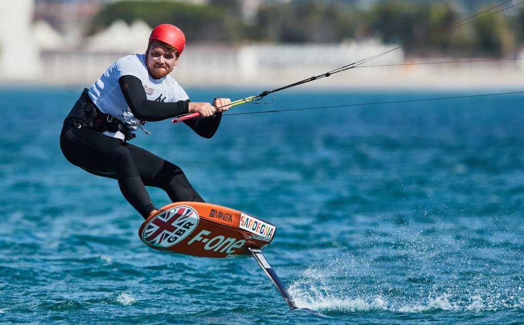 The British celebrated as best he could, topping the classification after the Day1 of KiteFoil World Series’ round 3 in Cagliari. Bainbridge preceded French De Ramecourt, Mazella and Gomez. Poema Newland leader of the Women classification