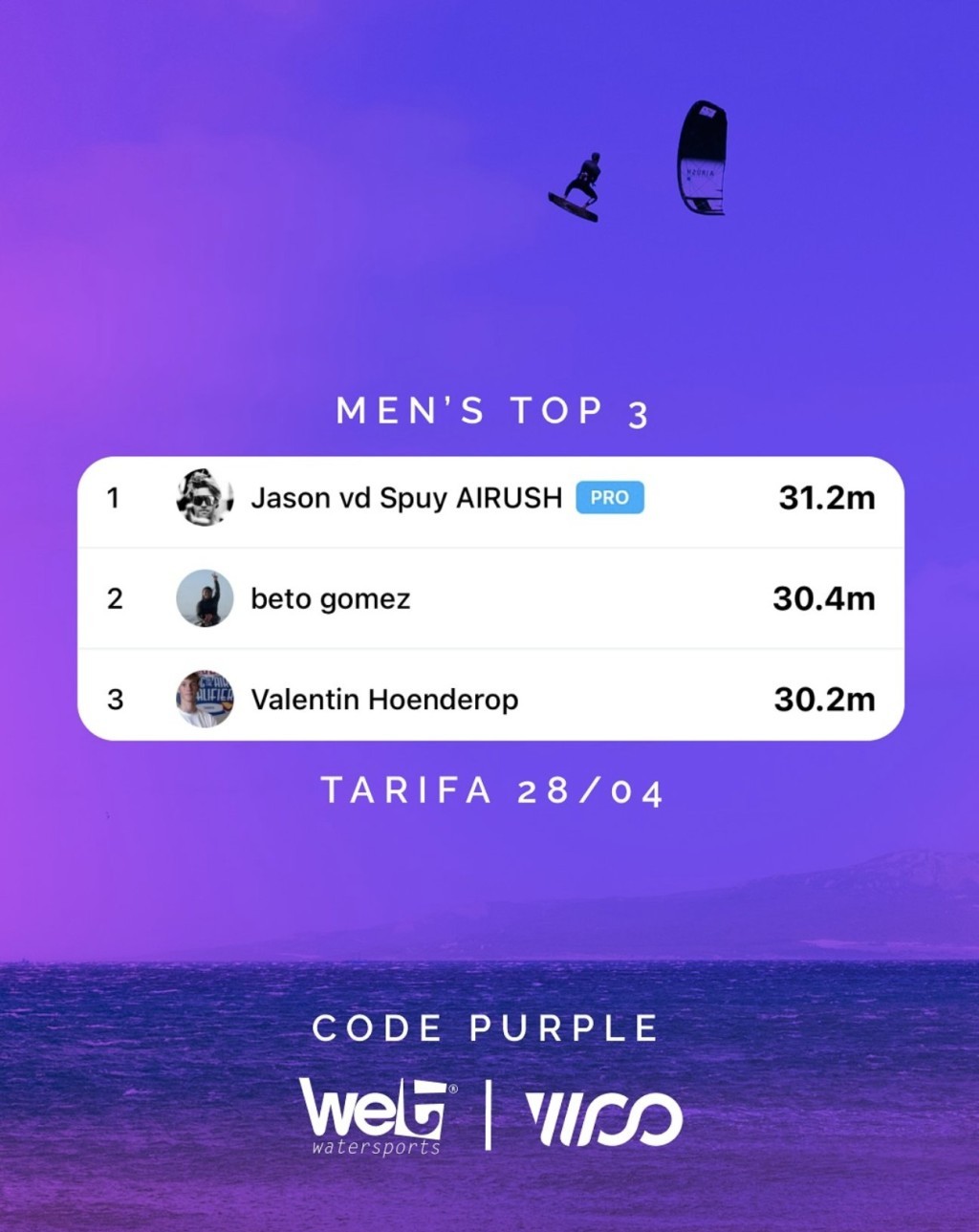 Jason van der Spuy soared to victory at the WOO Code Purple event in Tarifa, securing first place with an impressive 31.2-meter jump on the Airush Kiteboarding Lift Team 7m!