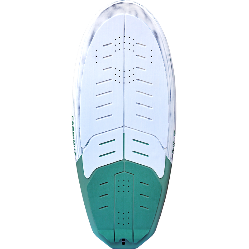 The double concave base shape is especially advantageous during takeoff and in case of accidental touch downs or landings after jumps. The full deck traction pad, made from Friendly Foam biodegradable EVA, is designed specifically with foiling in mind. Its low profile corduroy grooving provides the perfect combination of comfort and traction, and the strategically placed cutouts offer extra grip where needed.