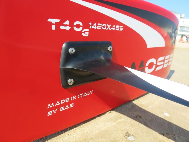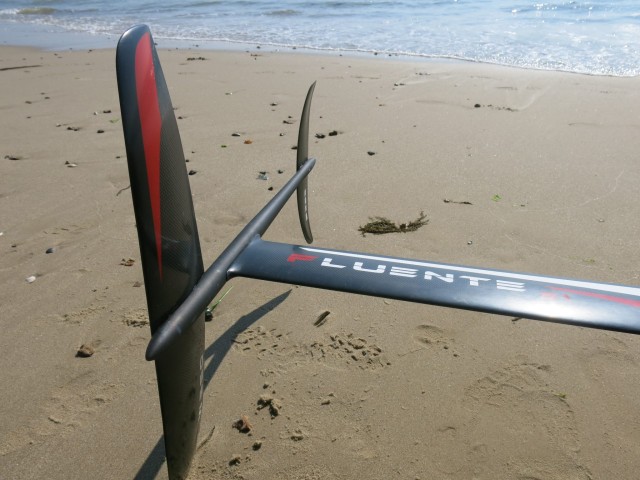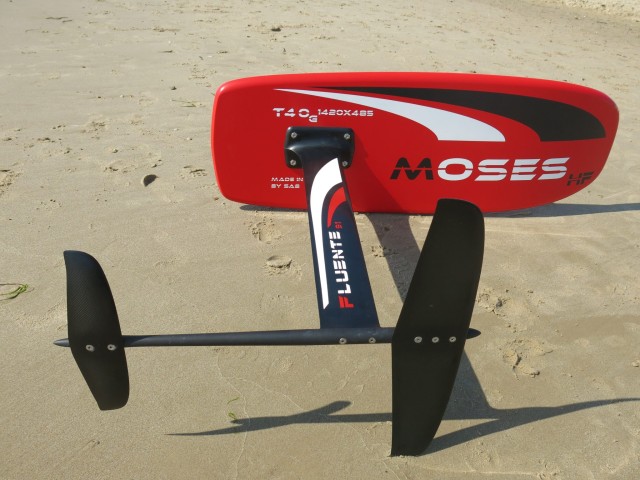 The Fluente is their wave/freeride foil; it’s designed to get going at low speeds and allow control in turns while still delivering a decent top speed of over 20 knots! We used the T-40 board during our test. It is worth noting though, the foil is compatible with the entire Moses range of boards and uses the prominent four bolt connection system and can be used with any twin track or four bolt board.