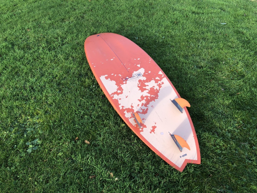The board is a compact shape, with the wide point forward, unlike the other “no nose and tail” shapes the board retains the point on the nose and the fishtail, but because of the compact nature still has a reasonably parallel outline. Underneath there is a double channel under the nose which runs into a concave midsection that washes out towards the tail.