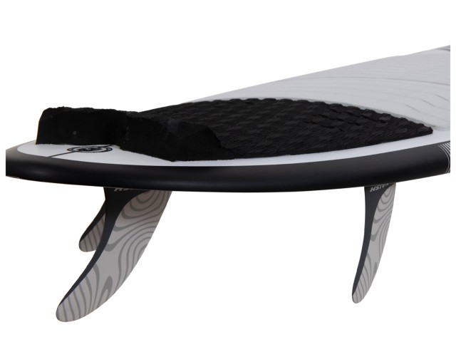 They have also paid attention to the finer details of the board's design. The 3 piece traction pad offers optimal traction without compromising foot positioning. Additionally, they have constructed the board with an extra rail band of 4 oz S-glass to prevent rail cracks, even when landing big airs. The arch traction pad adds both grip and comfort to your session. The three-fin setup is strategically designed to enhance control, particularly for quick and snappy releases off the top. The rail design supports smooth riding and carving, allowing for easy and flowing turns. The rounded pintail shape ensures exceptional control and a smooth riding experience.
