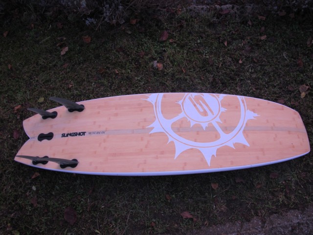 Slingshot have totally revamped their surfboard line up for 2014, and the T-Rex is the flagship in terms of design. It’s different, very different, from anything you may have seen on the market. By removing just under a foot off the nose the weight of the board is reduced, which makes it perfect for aerial freestyle. Whilst the nose has been chopped the board retains the dimensions, in terms of width and volume, of a much larger board than the 5’4” stature it boasts. There is plenty of volume underfoot and the width at 18 3/16” makes it fairly wide too. With a total of 26 litres of volume Slingshot have effectively packed alot into a very short length. There is a simple concave underneath and the rail shape is about as classic as you could get. The rear end boast a deep swallow tail to help with drawn out carves and there is a good amount of tail and “nose” rocker with a flat section for speed in the middle. It comes with 5 fins, and you can either ride it like that for the ultimate in low-end power and drive, or set it up as a fast and loose quad, or even a traditional thruster. Pads are factory fitted, but the straps are of course totally optional.