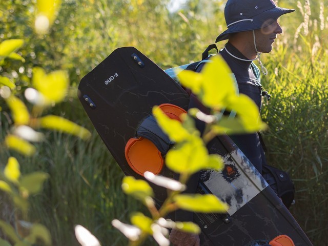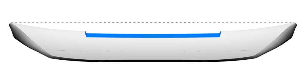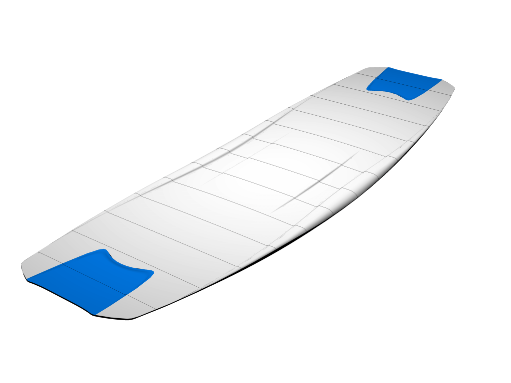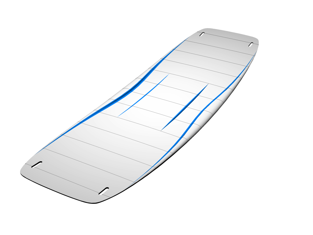 In the feet area, the inverted and thick rail profile creates two support zones that eliminate bouncing effects. It generates impressive vertical lift, enabling early planing and remarkable drive. Landing jumps and executing tricks becomes effortless. The sharpened top edge reduces water spray towards the eyes and legs as well.