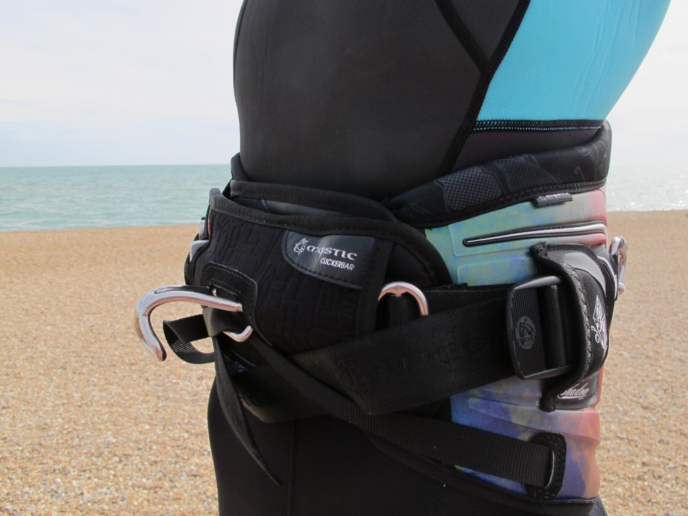 There’s a Velcro ‘battlebelt’ waist closure and a single point buckle system holding the spreader bar in place, with an additional webbing strap which keeps the hook held down low. The Mystic version 3 Clickerbar works well, making the harness quick to close, the push mechanism to release it again took a bit of practise as there’s a certain knack to it, once you’ve mastered it though you don’t have to think twice. The integrated spreader bar pad has a kite line knife tucked away neatly too should you ever be in need of one. Delta shaped power rings hold the handle pass leash in place and the side buckles are covered to prevent wear from carrying your board.