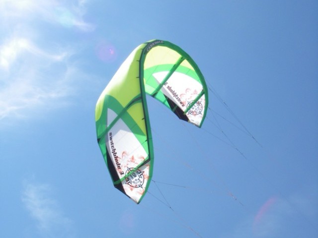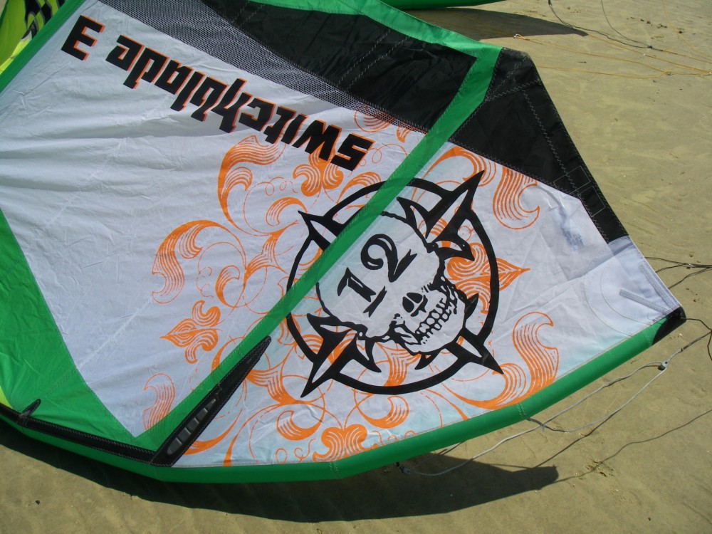 The first thing you notice about the Switchblade 3 is the raw power it delivers, back to back with other kites of a similar size the Cabrinha consistently delivers more grunt and more power. The kite has quite a flat arc shape to it, which delivers more power per square meter, yet at the same time providing plenty of depower. With all this power comes control as although the pulleys have gone on the bar the kite still has a relatively short depower throw. This means that with just a small movement of the arms you can dump power as you need to and have a smooth enjoyable ride. The Switchblade is also very stable; small input on the bar won’t have it whipping around the window like an angry wasp. This means for freestyle tricks you really can park and play with the Switchblade 3. The steering, once engaged, is quite quick, it certainly feels faster and more direct than last years model. There is a slight delay when you engage the bar, this helps the kite remain stable, but once the kite turns it has a good amount of pace to it. The pull is smooth and consistent and kite loops are an exciting affair. The kite rides well upwind and its grunt and power will get you up there very early on. It is also a very easy kite to fly; whilst it has been designed with wakestyle in mind the Swithcblade 3 isn’t just about that. The light bar pressure coupled with the predictability of the kite make it a good kite for the aspiring intermediate rider who wants a kite that will see them through to expert level and still excite them as they get better. As a lightwind power house the kite should also be considered by all those looking to be among the first to get going down the beach. It has probably one of the best low ends of any of the 12m kites we have flown this year.