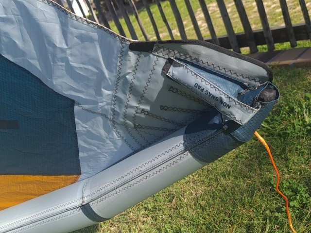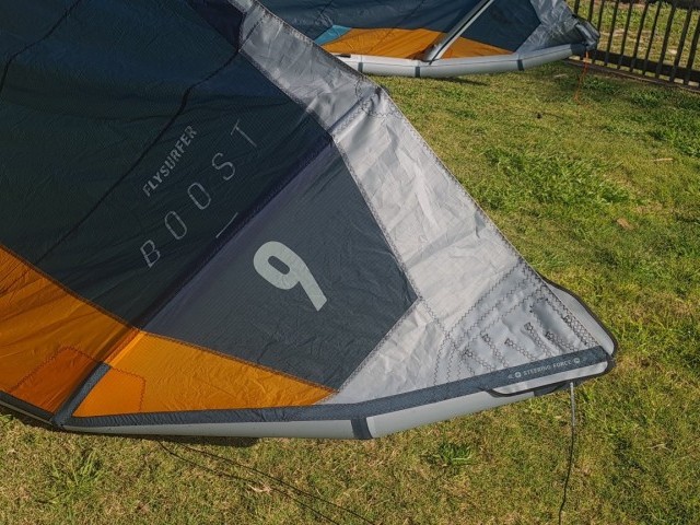 As soon as we pumped up the Boost, we noticed the wingtips are swept back prominently, with a thin leading edge and five thin struts. Reinforcements have been added to key areas, with dacron patches preventing wear on the wingtips and throughout the leading edge. The snag pads in the wingtips should prevent the bridle from getting tangled during launch, landing, or the dreaded water relaunch. The trailing edge has been reinforced with a double layer of sail material and minimal dacron, which looks to make a big difference in the weight. Genius.