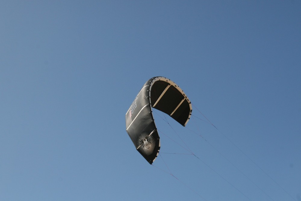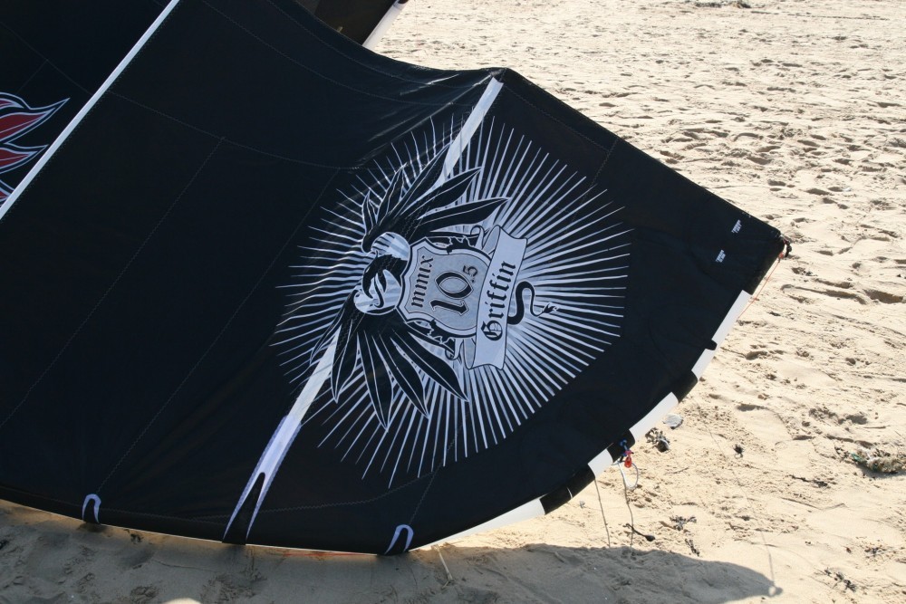 One of the first things you notice about the Griffin is the power it produces. It is one of the few kites on the market with no centre strut. This gives a large flat power zone in the middle of the kite where you need it the most. The 10.5 is also very large for its size. Stood next to the Starkites ExA 11m for instance it is considerably bigger. Obviously this larger sizing coupled with the flat centre section gives this kite an impressive bottom end. As soon as there is enough breeze to hit the water then the 10.5 has enough power to put a smile on your face and pull you upwind. The low end upwind ability of the kite was very impressive, the kite was really attacking the edge of the window and pulling you to windward. The Griffin is also fairly nimble for its size, although it is very stable in the air it turned quickly when you engaged the bar. Jumping was a relatively simple affair; the timing is straightforward and it is an easy kite to get dialled into. The jumps themselves weren’t ripping us from the water, but once you were airborne the kite delivered an impressive amount of float. Looping the Griffin is a balls out affair, the kite delivers a lot of power through the turn and the yank you got as you sent the kite through the power zone was impressive to say the least. Definitely not for the feint hearted. Griffin aim this kite at the all round market, and it certainly fits that bill well, easy to fly and stable enough for a beginner, fast enough to turn in the waves and exciting enough in the air to please most free riders out there. Unhooked the kite works well too, it needs a little bit of trimming to get it happy, but once set it delivers a smooth powerful pull through your moves. If you want a low cost kite that delivers a surprising amount of quality and performance then the Griffin fits the bill.