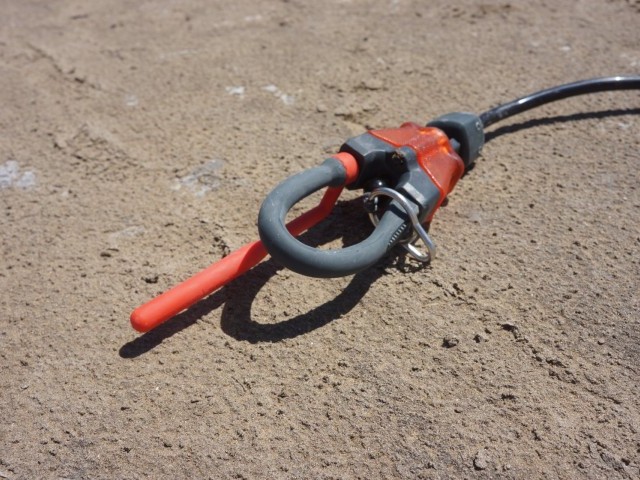 Starting from the bottom, the quick release is a simple push away affair with a robust release and moulded chicken loop. The security pin is easy to twist away for any unhooking and ensures a solid connection when clipped in. The safety leash connects to the single line reride system with the standard loop connection, which can also be threaded through the chicken loop for those who wish to ride in ‘suicide’ mode. The centre line has a PU covering for protection and a smoother glide, and there is an effective swivel situated directly above the quick release.