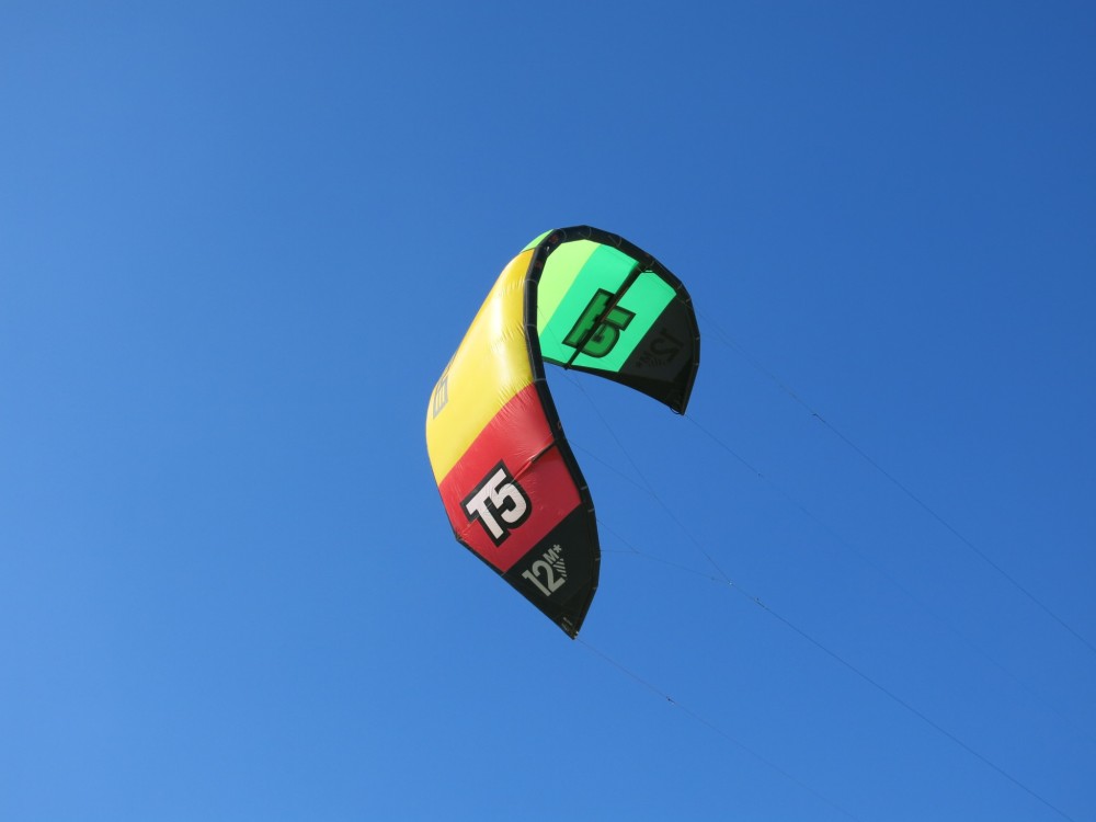 The first thing you notice about the T5 is the raw power it produces, as a 12m it is quite a large kite when you lay it out on the ground next to other 12m’s. This added canopy means it has a very impressive low end that will get you up and riding in the lightest of airs while other riders with 12m kites are still waiting for a couple of extra knots. The airframe is very low profile with the leading edge being relatively thin, this means the kite can fly forward into the wind and fly fast. These two attributes add to the great upwind abilities and even riders who struggle will find the T5 happily pulling them back up into the wind. The wide wing tips allow the kite to have an impressive turn for a 12m, obviously it isn’t as fast as its smaller brethren, we tested the 10m a little while back, but it is no slouch for such a big powerful kite. Relaunch is very good, although when the kite is at the bottom of it’s range, around 11knots, depending on weight, you will need to put some effort in to get it off the water. Jumping is great fun on the T5, the low aspect ratio offers plenty of hangtime and float. Unhooked the kite behaves really well and it’s great for wakestyle tricks as it is reasonably stable.