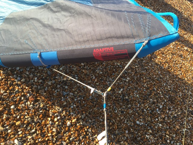 Loop between the blue and black webbing: High depower setting – highest depower, best sheet and go, best jumping.