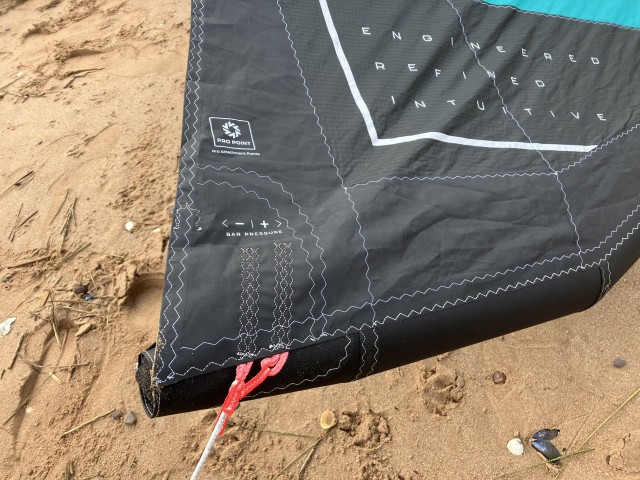 The features which set apart the 'Pro' from the regular Orbit are evident before you put the kite in the air and can be split into the following categories; weight saving, drag reduction and bridle tuning. The weight saving measures are no joke, and yes they may have longevity implications long term, but remember that the Orbit Pro has been produced in the pursuit of competition winning performance. Reduced weight bladders are used throughout the airframe, 4 of the 5 one pump strut isolation clips have been removed (the central one remains), there are only 2 (instead of 4) rear line pigtail bar pressure tuning options, new reduced diameter bridle lines have been used, seam protector patches have been reduced in size, and perhaps most significantly, the Orbit Pro features North's proprietary N-Max material throughout its airframe which is 13% lighter than standard 156 gsm Dacron.