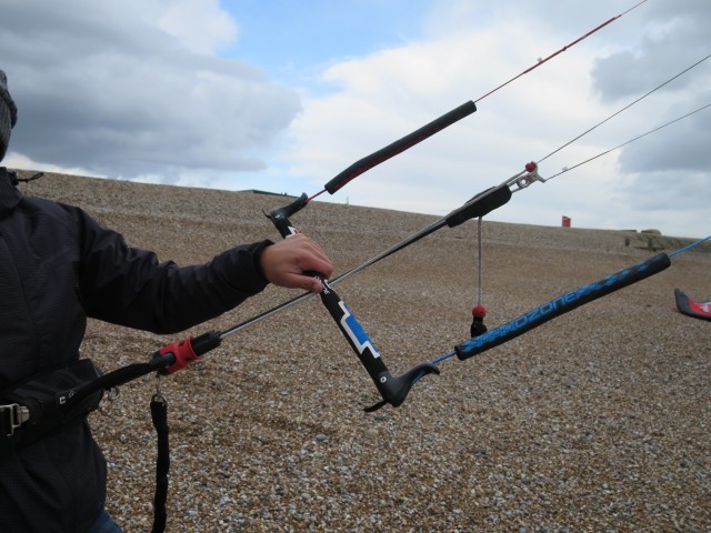 The Contact Control System from Ozone is a 4-line set up with a push-away quick release. The mechanism is very clever and really easy to operate even under high load, it is also very simple to reconnect when you want to get riding again. Top marks for calling it the Megatron too, which instantly makes it even better, it can be set up in a standard safety mode, or a suicide mode. There is an above-the-bar trim system which uses a cleat and also a magnet to keep the trim line neat and tidy. Overall the set up is very clean and simple with no extraneous clutter, the safety is a front ling flag system so you can completely ditch the power in the kite if needs be.