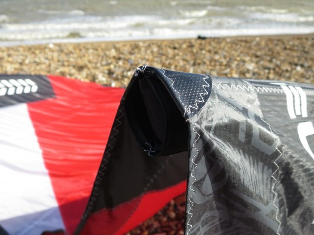 It’s a hybrid SLE design; with a very short compact bridle that uses two Ronstan low friction rings to help the kite trim it’s angle of attack as you sheet in and out. There is a large inflation valve to make getting on the water faster, and there are also multiple trim options on the kite. It is well built with reinforcements on the leading edge and also the trailing edge too.