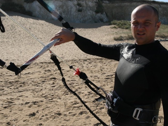 All RRD kites work off the same bar, so you can just buy one bar for your entire quiver. It is a neat idea. A new 2010 bar is still in development so we were riding with the bar from 2009. It comes packed full of features including an excellent above bar clam cleat depower strap. The bar itself is made from carbon fibre and the centre hole features an aluminium block that has been polished to reduce friction on the depower rope. There are also O’Shit handles for added safety and the bar ends are covered in a softer material so they are easy on your hands and non-slip for kite loops.